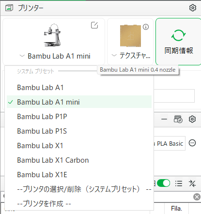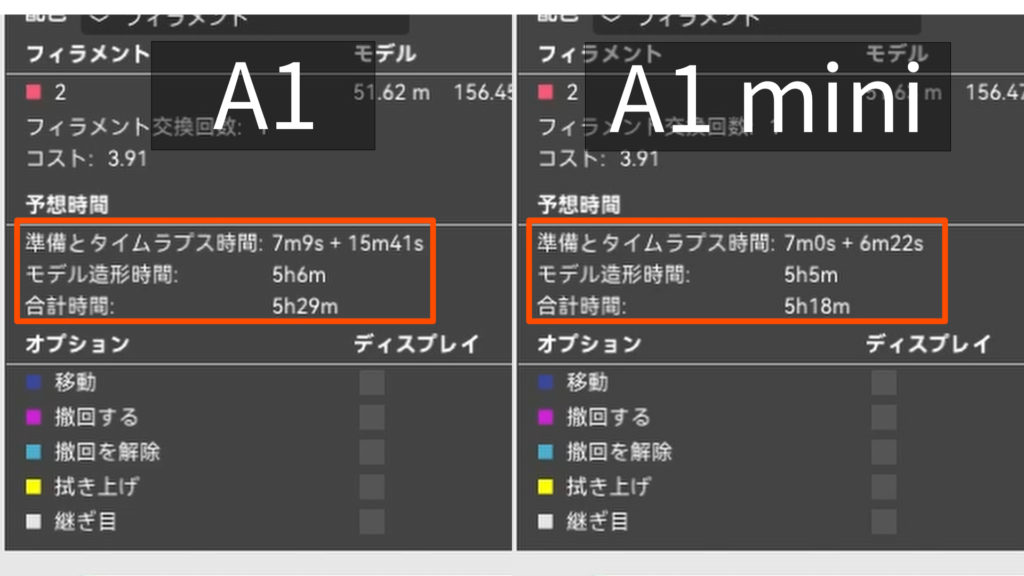 - Bambu Studio上だと同じ設定ならA1miniの方がA1より造形時間が短く表示される