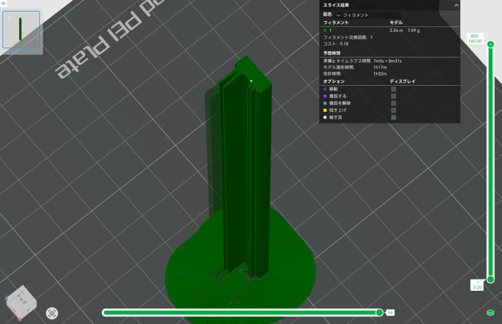 スライサー上では「miniの方が速い」と表示されるのに、実際に印刷して測ると「A1」の方が速いんです。