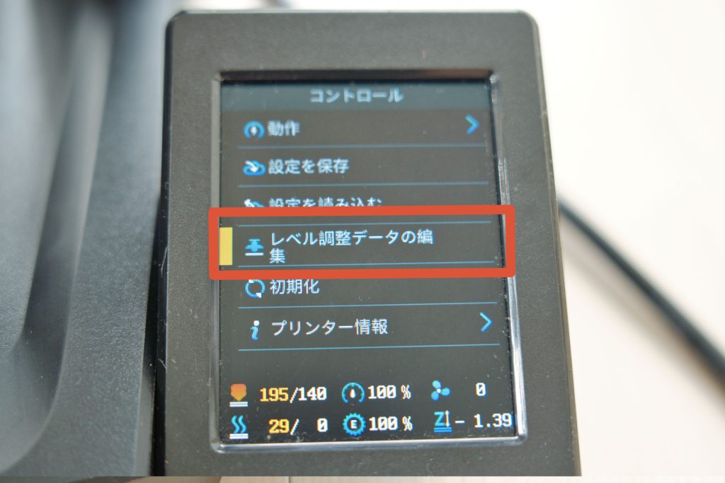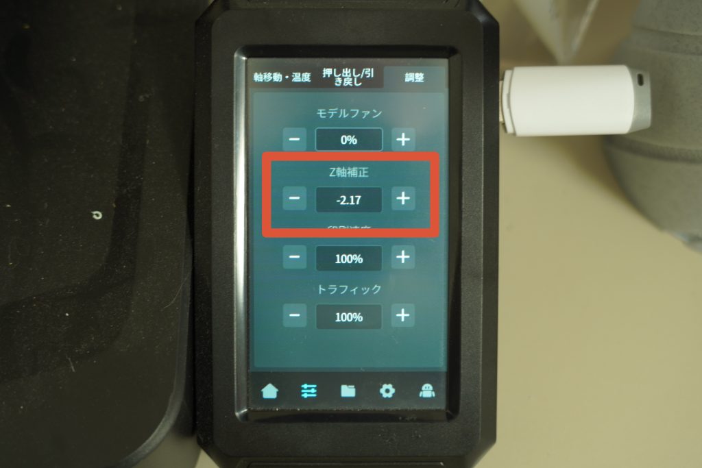 オートレベリングをした後、そのままだとZ軸の数値がかなり高めになってしまうので、1層目が上手く定着しないことがよくあります。