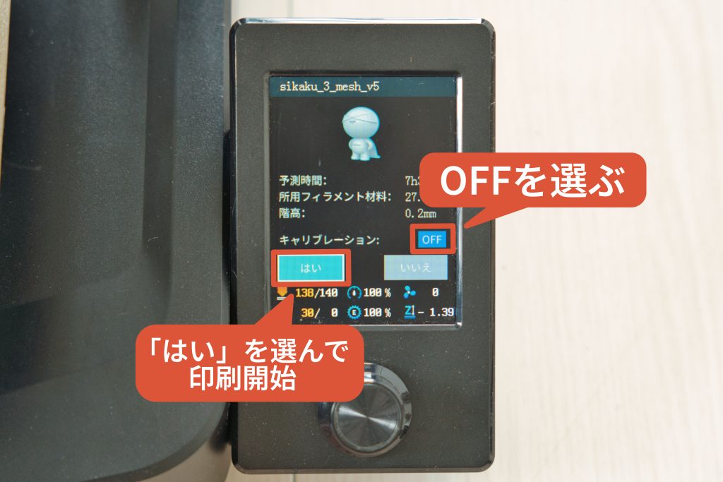 キャリブレーションをオンにしてしまうと、またオートレベリングが始まってしまうので、「OFF」を選んでから、「はい」を押し印刷開始です。