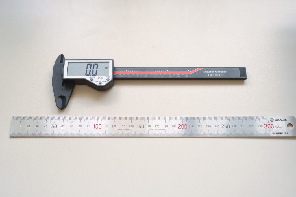 単純な形状なら定規で十分ですが、複雑な形状のものを測る場合や、精度がいい収納を作りたい場合はノギスがあると便利です。