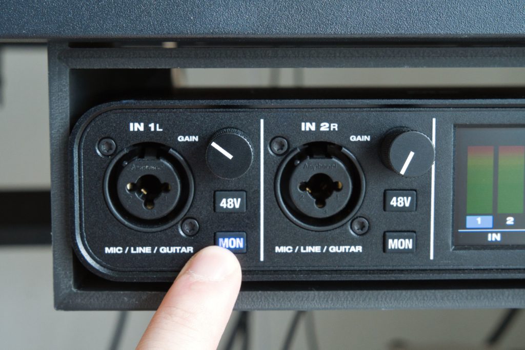 例えば「インプット1のマイクだけモニターしたいけど、インプット2のギターはモニター不要」みたいな状況でも、個別にON/OFFできるんです。
