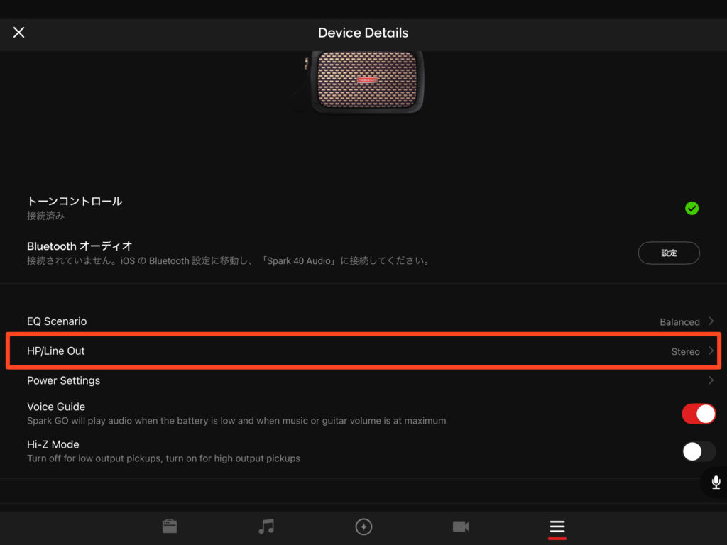- アプリ連携(トーンコントロール):Spark専用アプリ(iOS/Android)を使ってアンプの音作りや機能操作を行います。こちらもBluetoothで接続しますが、一度ペアリングすればアプリ側から自動的に接続されます。